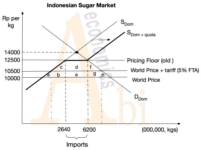 Relative to a free-trade environment of no trade protection barriers, imported sugar would be available at approximately Indonesian rupiah 10,000 per kg (or US$0.62 per kg). Rather Indonesia sets a minimum price of 12,500 per kg[1]. This higher minimum price induces efficiency losses of areas “a + b + c” and “f + g + h”. The areas “a + b + c” represent production inefficiencies of increased domestic production above the low-cost imports. The areas “f + g + h” represent efficiency losses due to the need to ration consumer demand reduced total sugar supply.